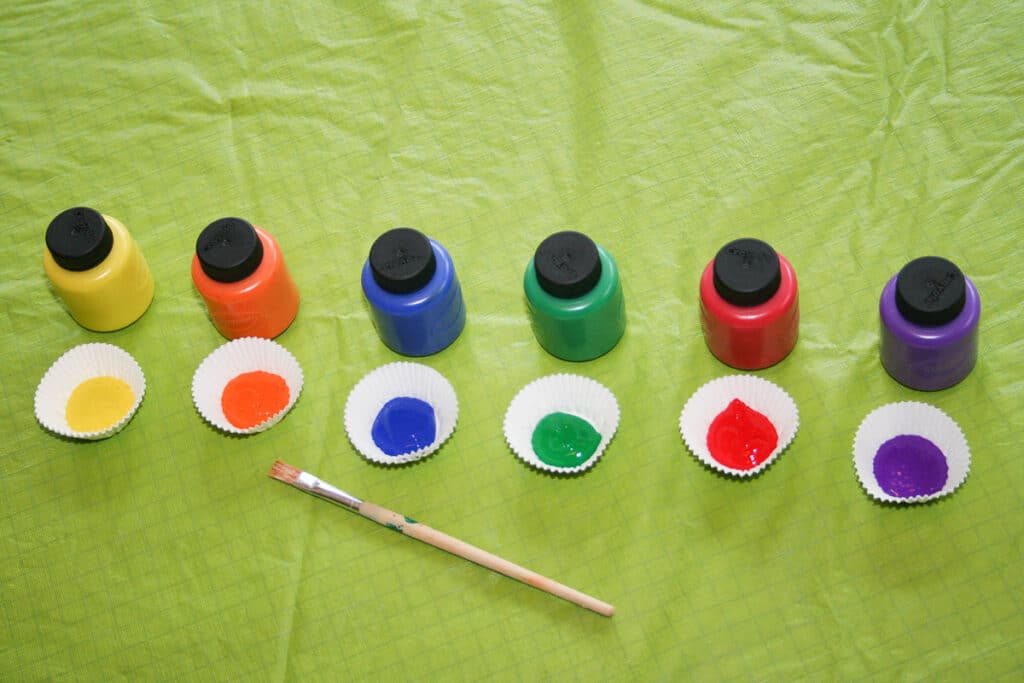 - Fülle jedem Kind eine eigene Farbpallete in Eierbecher oder andere kleine Gefäße ab, so dass es nicht zu Streit und Schmierereien kommt.